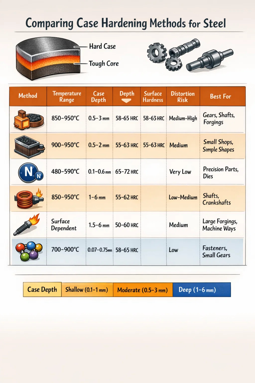 | วิธีการ | ช่วงอุณหภูมิ | ความลึกของเคส | ความแข็งพื้นผิว | ความเสี่ยงจากการบิดเบือน | ดีที่สุดสำหรับ |