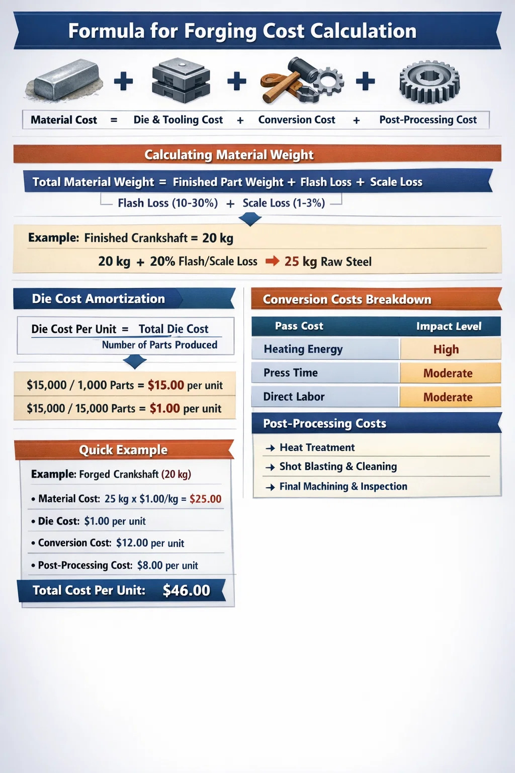 การคำนวณต้นทุนรวมของ การตีเหล็ก เกี่ยวข้องกับการสรุปเสาหลักสี่ประการ: ต้นทุนวัสดุ (น้ำหนักสุทธิบวกการสูญเสียแฟลช) ค่าเครื่องมือ/แม่พิมพ์ (ตัดจำหน่ายตลอดการดำเนินการผลิต) ต้นทุนการแปลง (พลังงาน แรงงาน และค่าใช้จ่ายเครื่องจักร) และ ต้นทุนหลังการประมวลผล (การรักษาความร้อนและการตัดเฉือน) สำหรับเกียร์ขนาดกลางมาตรฐาน วัสดุมักจะคิดเป็น 40% ถึง 50% ของราคาต่อหน่วยทั้งหมด ในขณะที่เครื่องมือถือเป็นตัวแปรล่วงหน้าที่ใหญ่ที่สุด