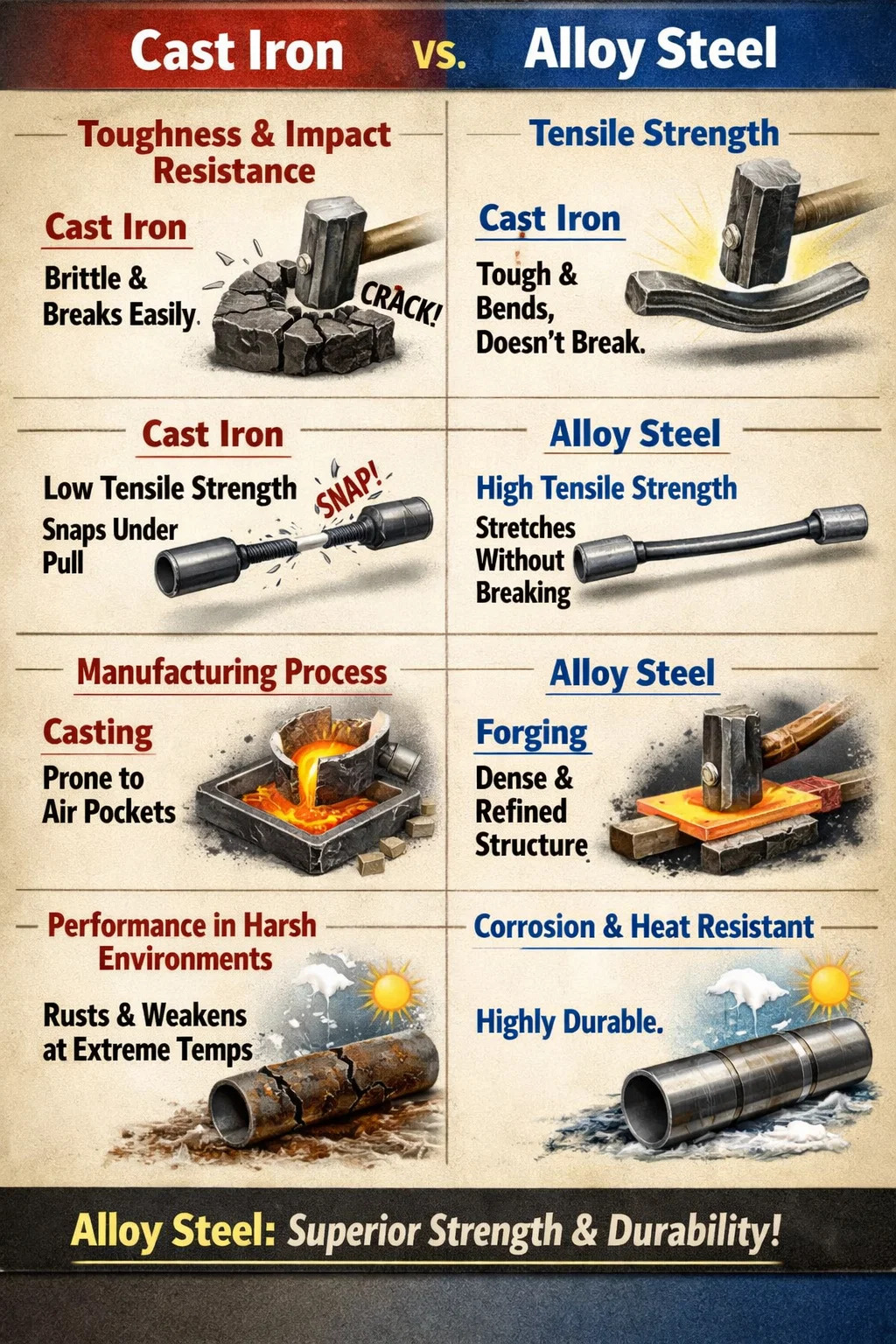 โดยทั่วไปแล้วโลหะผสมเหล็กจะมีความแข็งแรงและทนทานมากกว่าเหล็กหล่อ โดยเฉพาะอย่างยิ่งเมื่อต้องรับแรงกระแทก แรงตึง และแรงกดดันอย่างหนัก แม้ว่าเหล็กหล่อจะมีจุดแข็งในการใช้งานเฉพาะบางอย่าง (เช่น การทำหม้อหรือฐานเครื่องมือกล) แต่โลหะผสมเหล็กก็เป็นวัสดุที่เหนือกว่าในแง่ของประสิทธิภาพโดยรวม