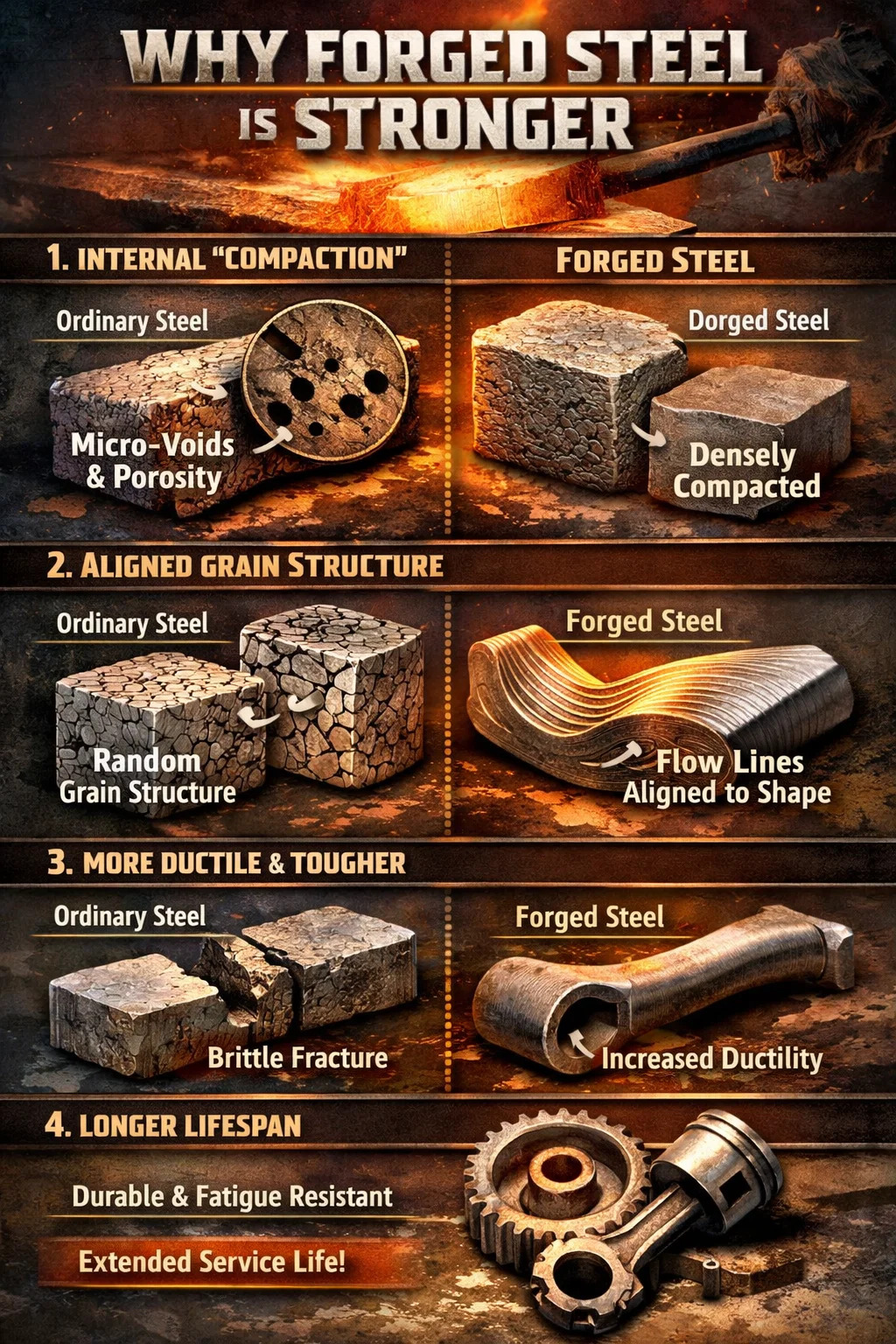 เมื่อผ่านกระบวนการตีเหล็ก โลหะจะผ่าน "วิวัฒนาการเชิงลึก" จากภายในสู่ภายนอก ต่อไปนี้คือสาเหตุทั่วไปบางประการว่าทำไมจึงแข็งแกร่งขึ้น: