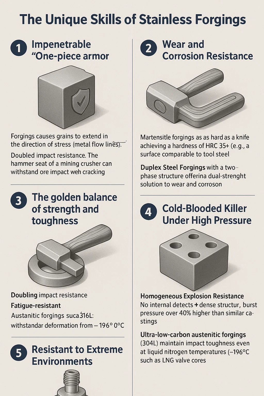 ทั้งความแข็งแกร่งและความยืดหยุ่น: การตีขึ้นรูปออสเทนนิติก (เช่น 316L) มีความทนทานอย่างไม่น่าเชื่อ โดยทนต่อการเสียรูปตั้งแต่ -196°C ถึง 800°C