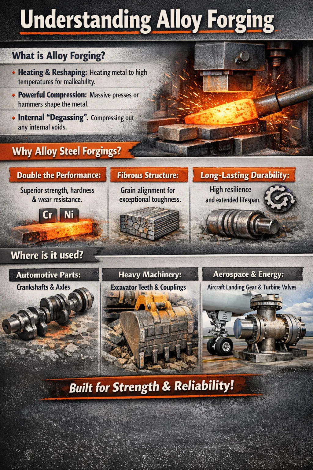 Alloy forging is the process of shaping alloy steel into specific forms using a "hot working" method. This not only changes the shape but also makes the metal stronger and more ductile through powerful compression.