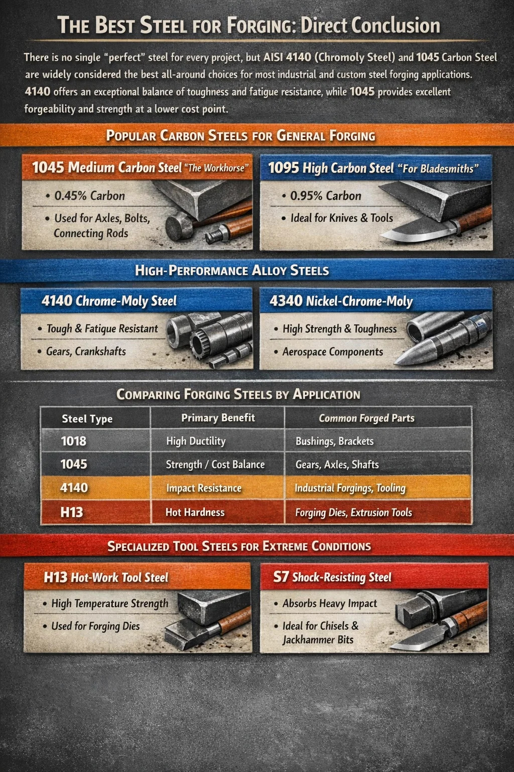 ไม่มีเหล็กที่ "สมบูรณ์แบบ" เพียงชิ้นเดียวสำหรับทุกโครงการ AISI 4140 (เหล็กโครโมลี่) และเหล็กกล้าคาร์บอน 1045 ได้รับการพิจารณาอย่างกว้างขวางว่าเป็นตัวเลือกที่ดีที่สุดสำหรับอุตสาหกรรมและงานคัสตอมส่วนใหญ่ การตีเหล็ก การใช้งาน 4140 มีความสมดุลที่ยอดเยี่ยมระหว่างความเหนียวและความต้านทานต่อความเมื่อยล้า ในขณะที่ 1045 ให้ความสามารถในการตีขึ้นรูปและความแข็งแกร่งเป็นเลิศในราคาต้นทุนที่ต่ำกว่า